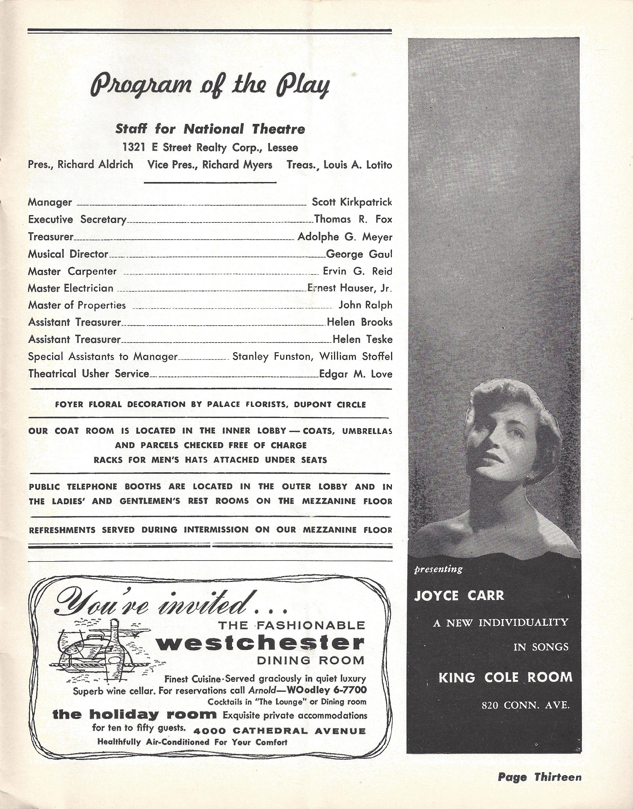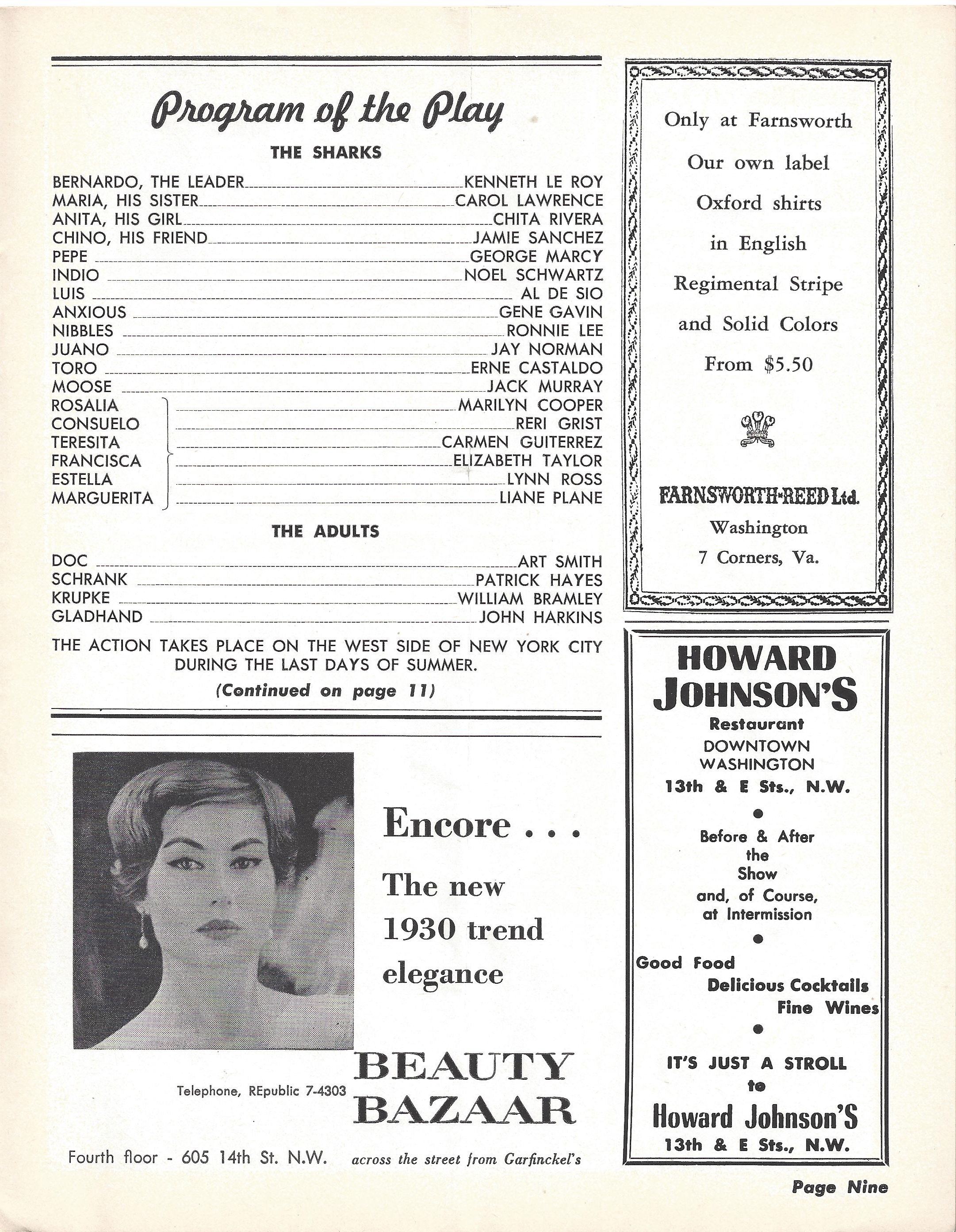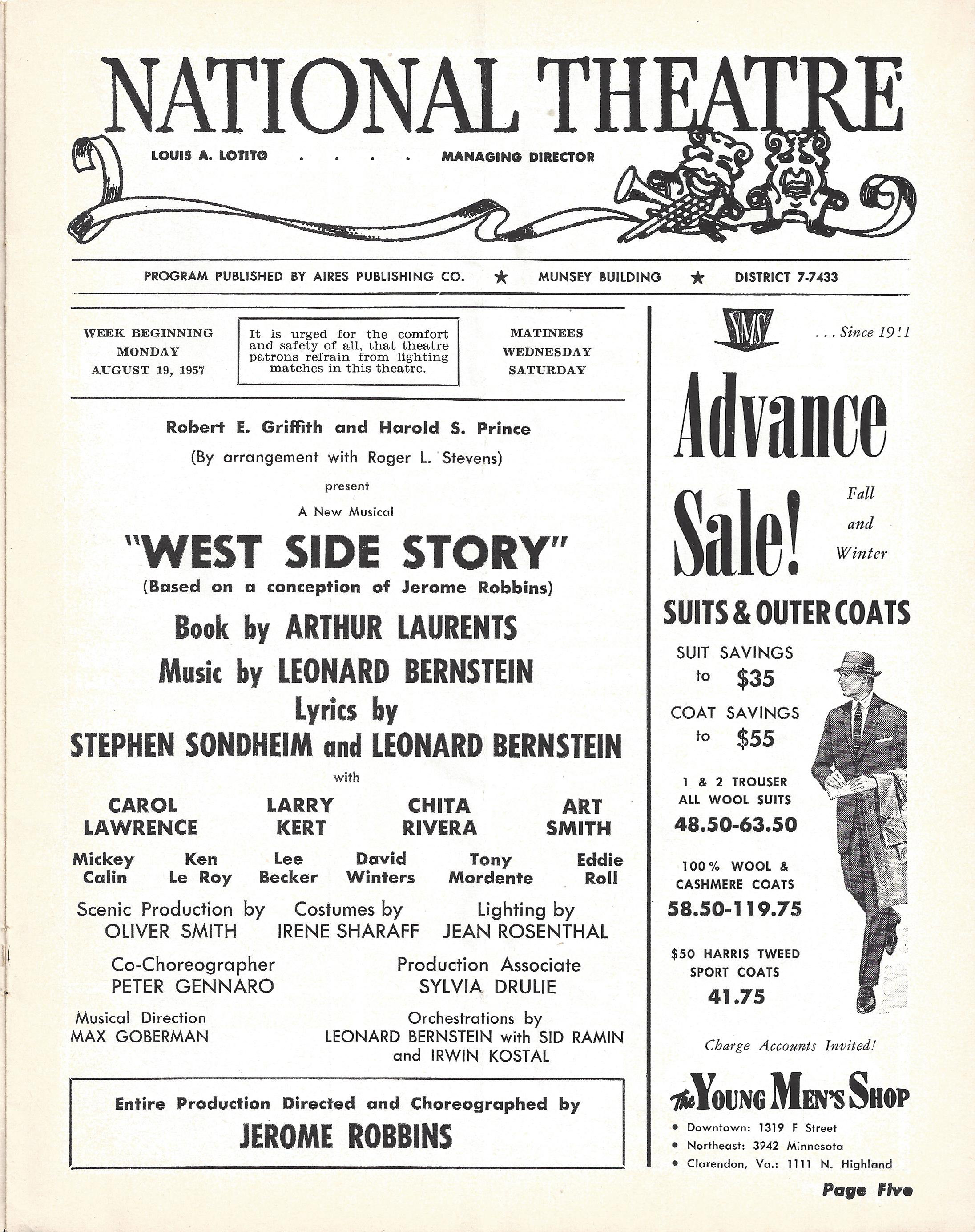 Want to take a look at some original West Side Story material? Check out some selections from the playbill for West Side Story‘s original run at The National. Unlike the program you saw on The Gang page, this playbill came free to patrons and featured a complete list of collaborators. Notice, too, that its full of ads. This gives you a sense of what kind of lifestyle theatre-goers of the period – particularly White, middle-class theatre-goers – were encouraged to embrace, assuming they had the money. This document is held in The National Theatre Archives.